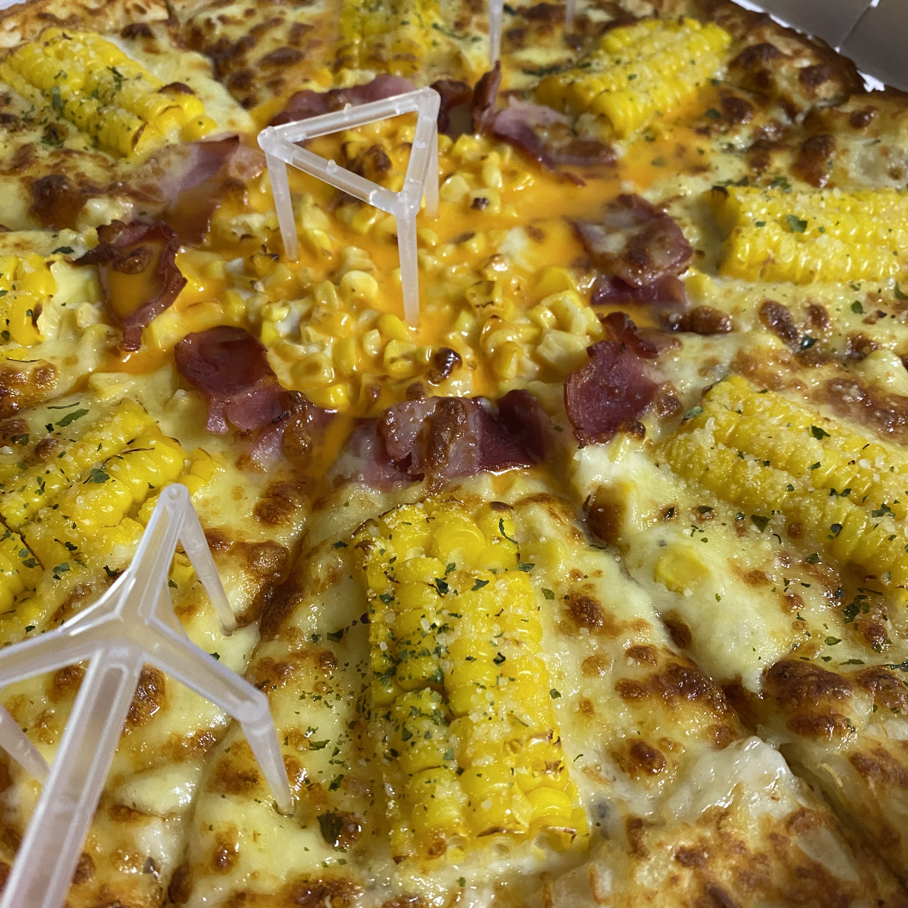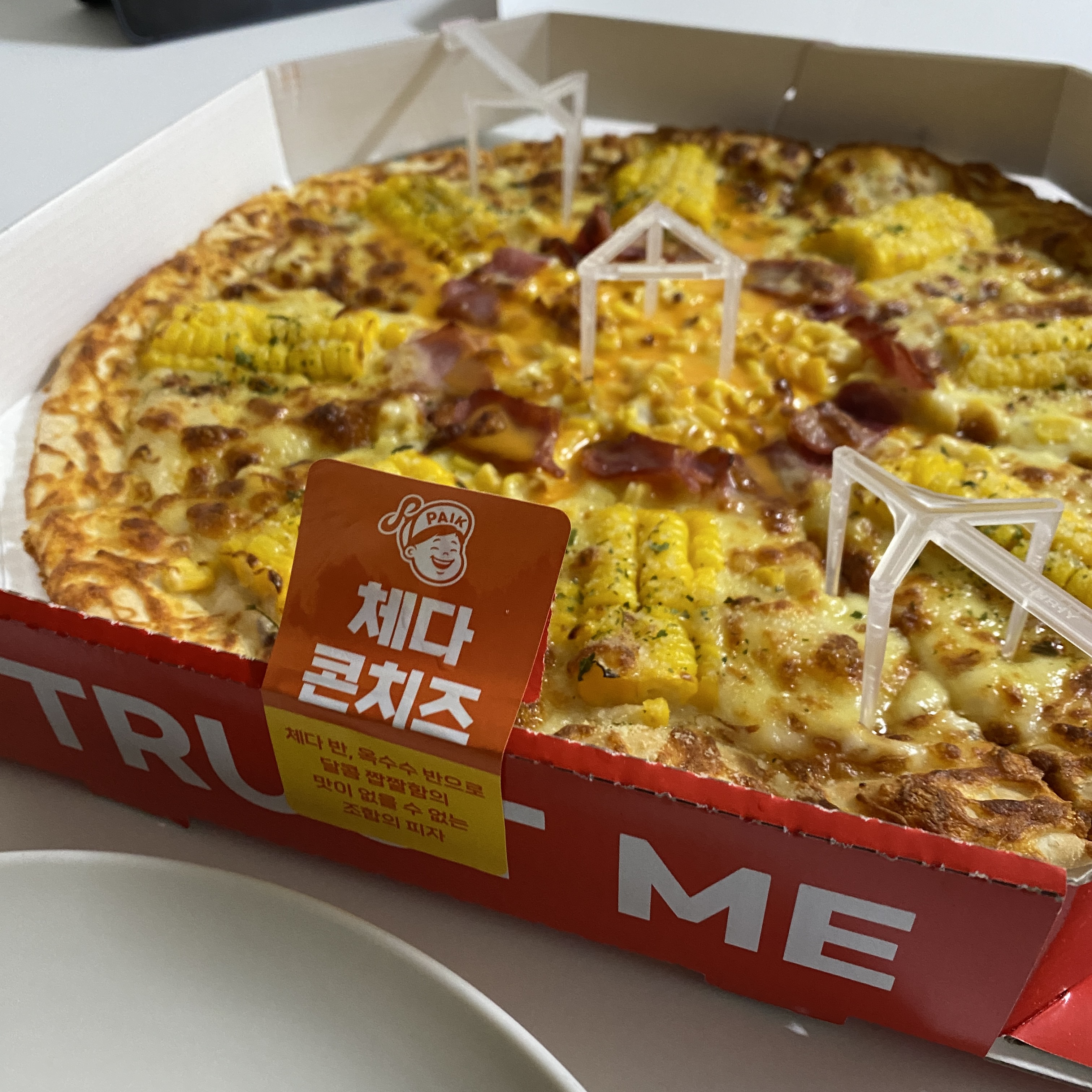 처음 주문했던 피자는 체다콘치즈 피자였다. 뭔가 옥수수하면 대체로 좀 맛있다는 생각이 들기 때문에 시켜봤는데, 역시 맛은 괜찮았다. 먹는데 옥수수가 좀 후두둑 떨어져서 불편함이 있긴 했지만, 그래도 괜찮았다.